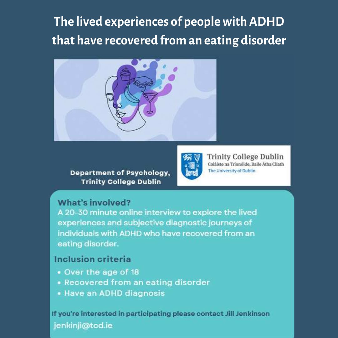 Researcher at Trinity College Dublin, Jill Jenkinson, is carrying out a study titled ‘An exploration of the lived experiences of individuals with ADHD who have recovered from an eating disorder.’ The research will involve a 20-30 minute online interview with participants who are over the age of 18, have recovered from an eating disorder and have an ADHD diagnosis.