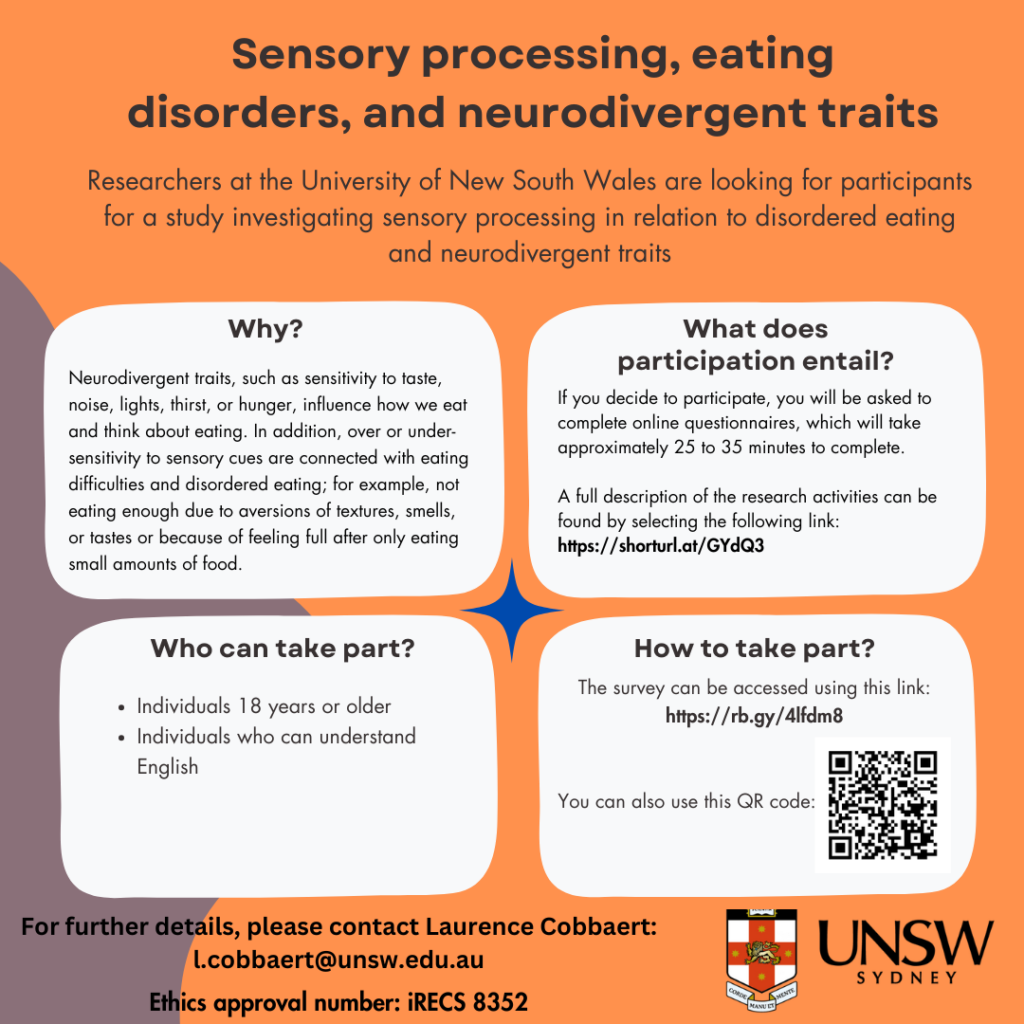 PhD student Laurence Cobbaert is conducting a research study on sensory processing, eating disorders, and neurodivergent traits.